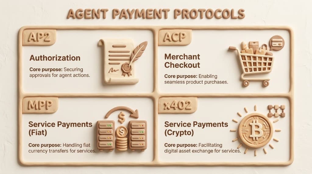 All four come up when you research agent payment infrastructure. They solve different problems: