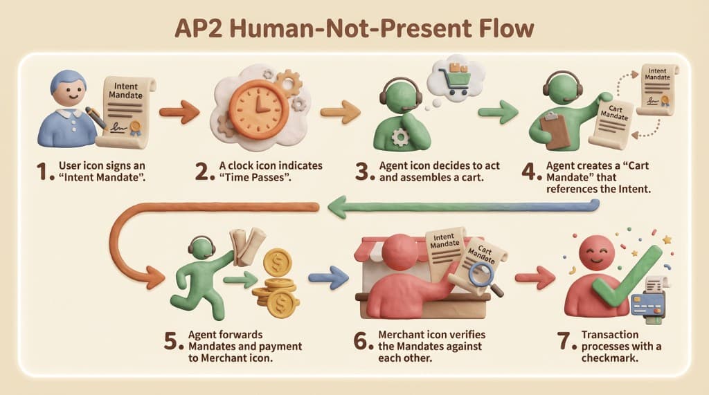 The user signs an Intent Mandate to pre-authorize an agent to spend within a scope. The agent can act later without real-time user approval.