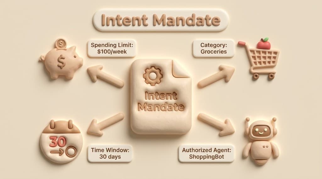 - User signs Intent Mandate upfront (e.g., "Agent X can spend $200/month on groceries")