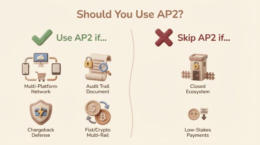 For most indie builders and small agent platforms, simpler authorization patterns (direct PSP controls, pre-funded wallets) are enough today. For enterprises, multi-agent systems, and any use case that needs audit trails, AP2 becomes important fast as agent volume grows.