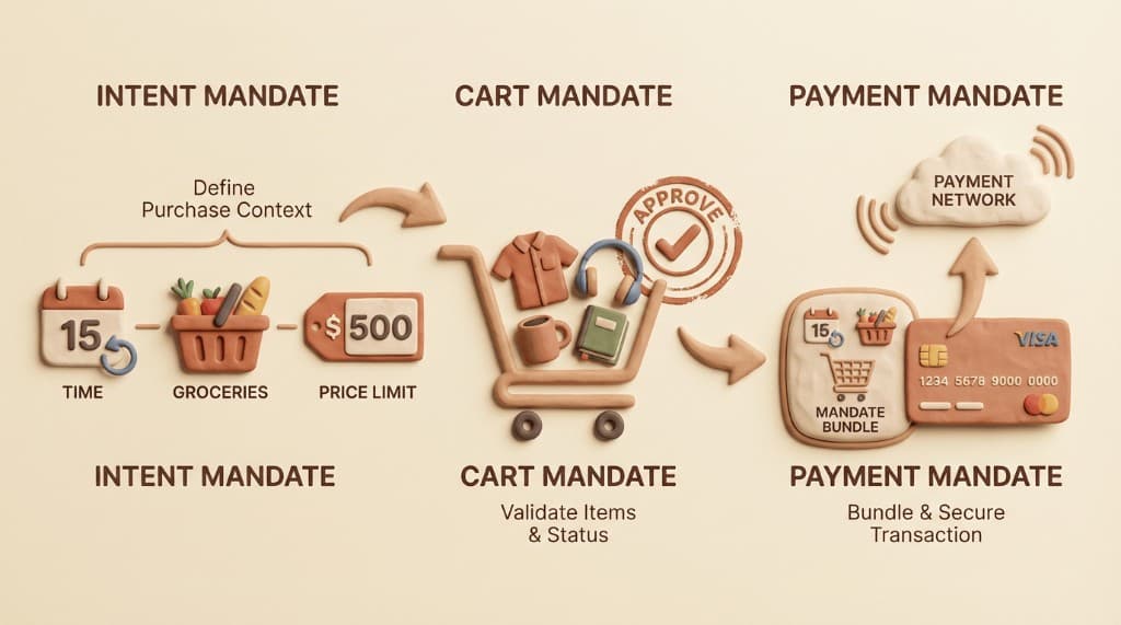 A Mandate is a cryptographically signed JSON-LD credential that encodes a user's payment instructions. AP2 defines three types: Intent Mandates (pre-authorized spending within scope), Cart Mandates (explicit approval for specific items), and Payment Mandates (sent to payment networks to signal agent involvement).