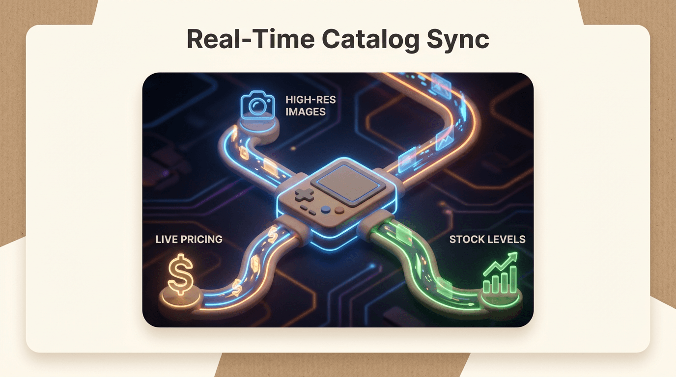 Pull live product details, prices, stock levels, and images directly from Amazon's catalog. Your listings stay accurate because the data is fetched fresh every time, not from a stale cache.